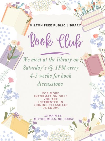 The Milton Free Public Library Book Club is meeting every 4-5 weeks and books are selected by the book club members. We currently have TWO groups and we welcome anyone who is interested in joining! Please call or email the library to be added to the member email list for updates. Feel free to bring a friend!